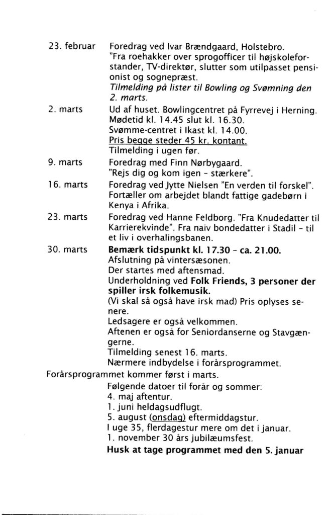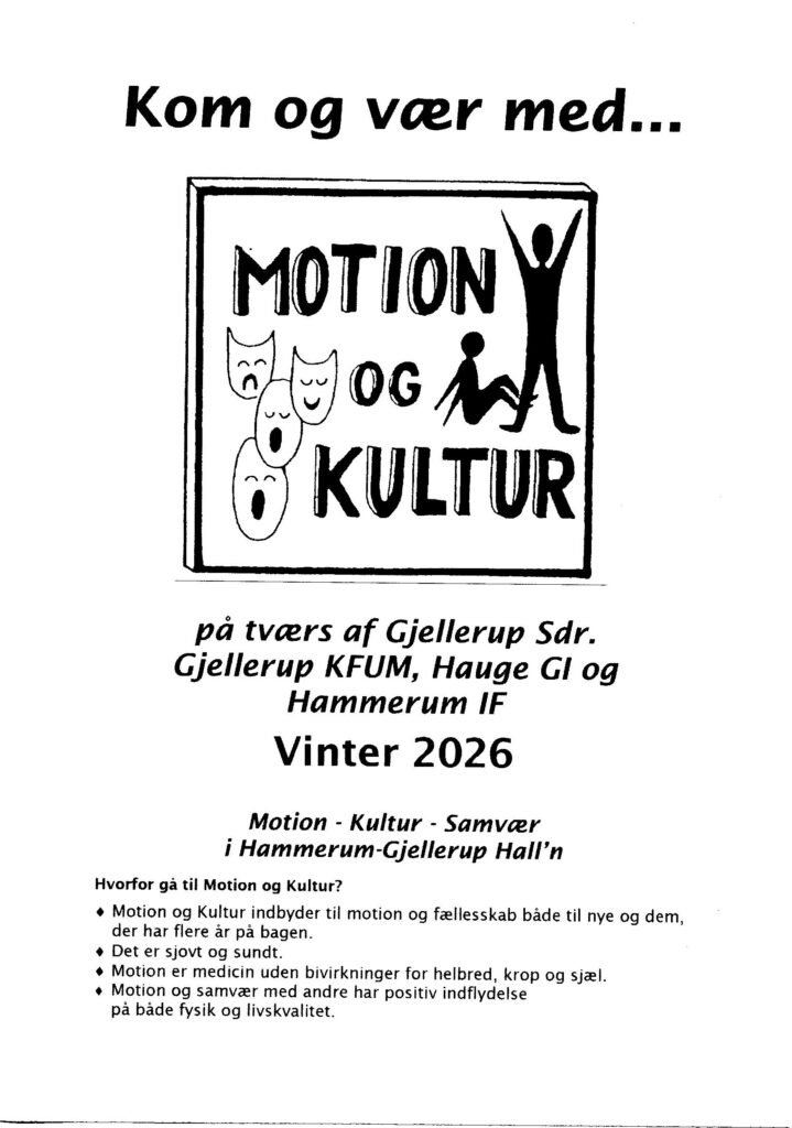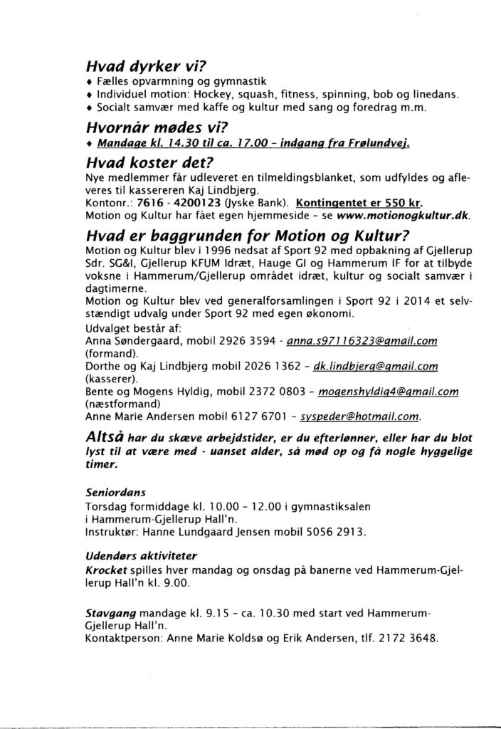 Fælles opvarmning. – Individuel motion, gymnastik, linedans, bordtennis, hockey og bob. – Socialt samvær med kaffe og kultur som sang, møde folk fra lokalområdet, dans, litteratur, rejseoplevelser, banko.